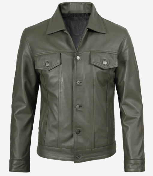 Upgrade your outerwear with the Men’s Trucker Leather Jacket by Rustic Leathers, a perfect blend of rugged utility and modern sophistication. Designed for men who value functionality and timeless style, this jacket features a distinctive olive green leather finish paired with a classic trucker silhouette.